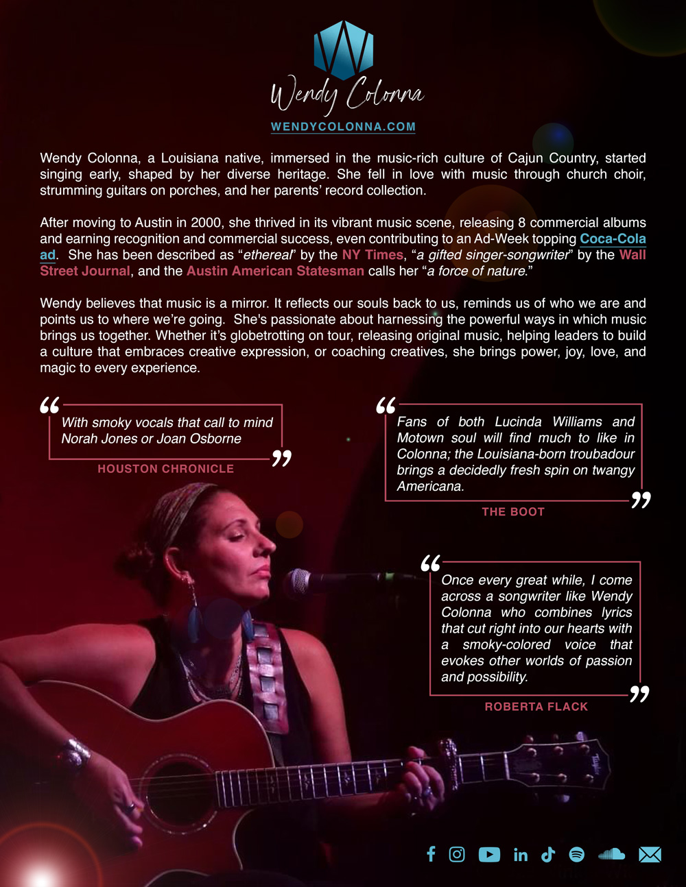 Wendy Colonna is a professional musician, mojo maker, and mentor. Wendy’s work is as varied as her influences. Through Custom Song writing, she crafts anthems and theme songs that capture the essence of personal brands, companies, and families. She also developed Mojo Tracks, a neuroscience-backed blend of affirmations and sound healing designed to help clients stay connected to their purpose through life’s highs and lows.
